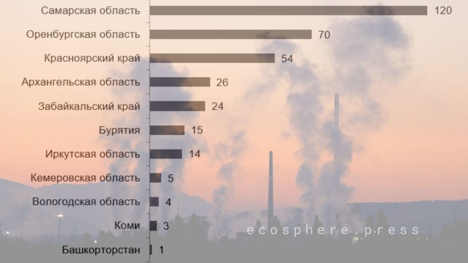 Главный загрязнитель — сероводород: 233 случая, или 69% от общего числа. Вещество второго класса опасности поступает в атмосферу с промышленных предприятий и объектов размещения отходов, при высоких концентрациях поражает центральную нервную систему. На втором месте — диоксид серы (49 случаев, 15%), возникающий преимущественно при сжигании угля и нефти. Третья позиция — бензапирен (48 случаев, 14%), канцероген первого класса опасности, образующийся при сжигании органики и входящий в состав выхлопных газов.